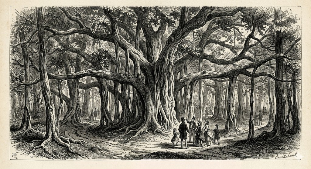 It does not so much grow as spread. It moves sideways the way a rumor moves through a small office, slowly at first, then with a kind of ambient inevitability that makes you realize, too late, that it has already reached the far wall. It sends down roots from its branches, which is a thing that trees are technically allowed to do but which most trees have the decency not to attempt. These roots descend like slow-motion anchor lines, and when they reach the ground, they thicken, and settle, and begin, over years, over decades, to resemble trunks of their own. Until you are standing under what you believed to be one tree and you realize you are inside something closer to a small, self-governing forest that has been operating under a single canopy this entire time, without telling anyone.